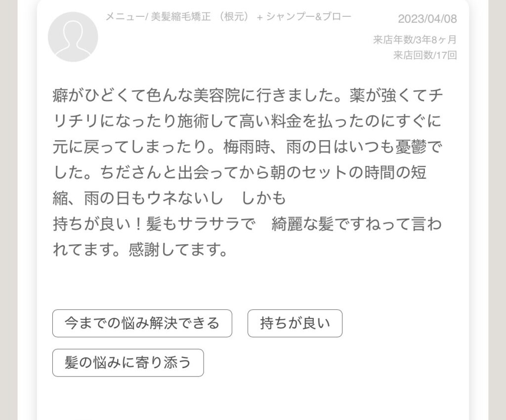 縮毛矯正特有の「針金のような質感」ではなく地毛のような柔らかい丸みが欲しい。